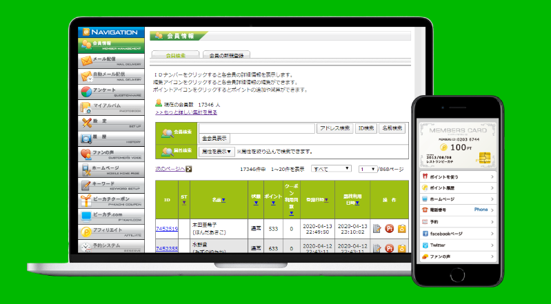 お客様属性や会員ランク、リピート数、クーポン利用数などの顧客管理ができます。